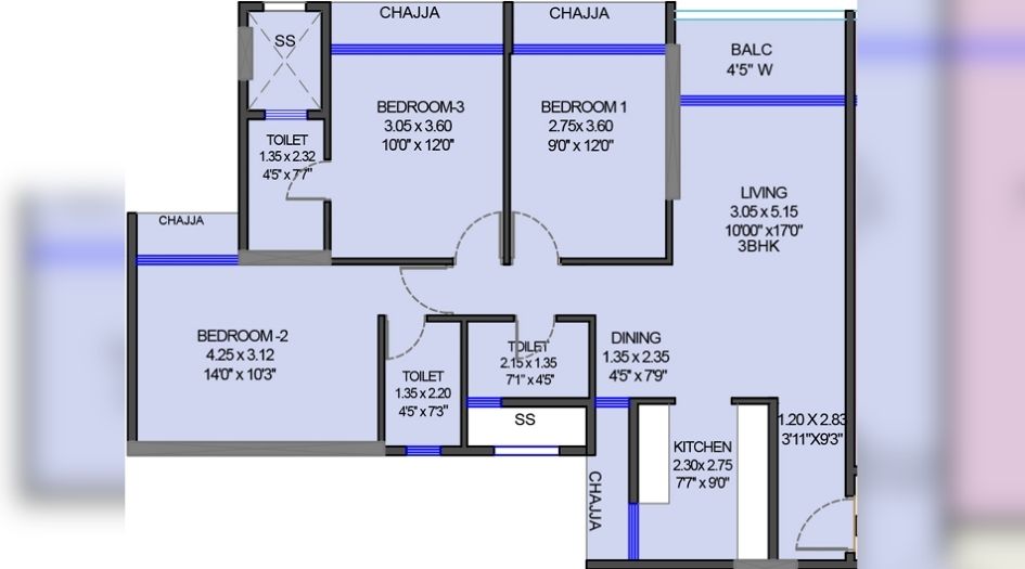 3 BHK | 1720 sq. ft. | ₹1.70 Cr* | Unfurnished |