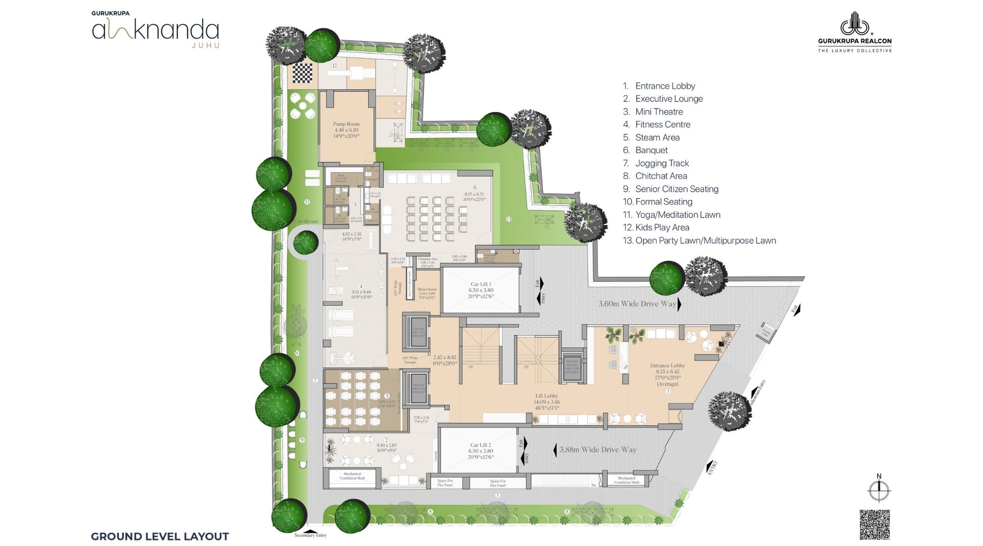 The development includes over 20 modern amenities such as a, Entrance Lobby, Executive Lounge, Mini Theatre, Fitness Centre, Steam Area, Banquet, Jogging Track, Chitchat Area, Senior Citizen Seating, Formal Seating, Yoga/Meditation Lawn, Kids Play Area, Open Party Lawn/Multipurpose Lawn. The internal features of Gurukrupa Alaknanda include anti-skid tiles, luxurious vitrified tiles, exquisite branded CP fittings, exhaust fan provisions, and granite kitchen platforms.